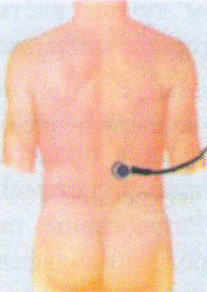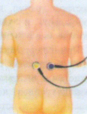 Снимаем информацию во 2-м режиме с области надпочечников (справа и слева на 1,5-2 см сбоку от позвоночника) излучателем синего/желтого цвета. Можно снимать информацию поочередно, либо одновременно двумя излучателями.