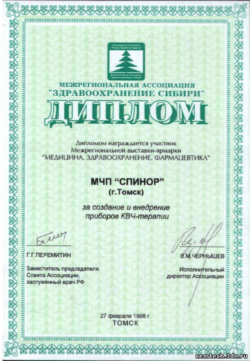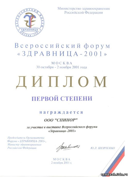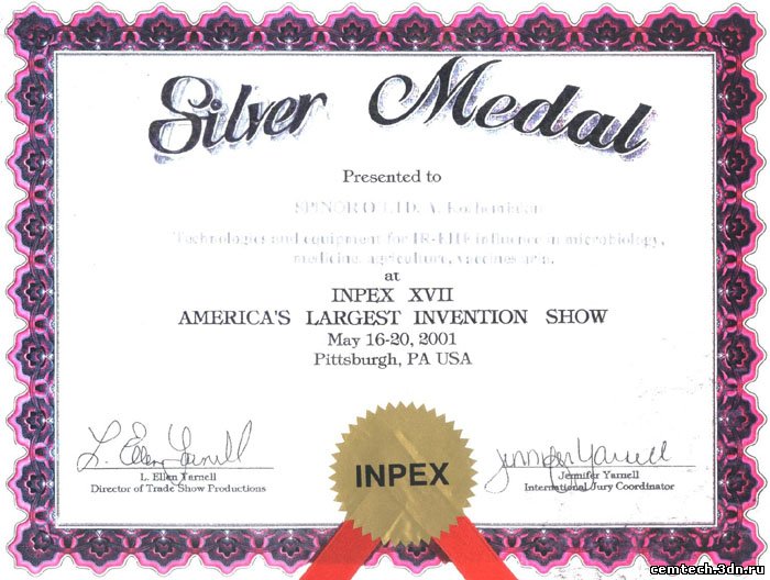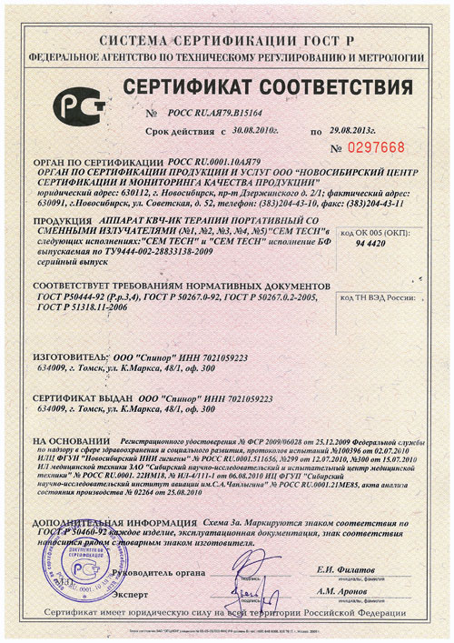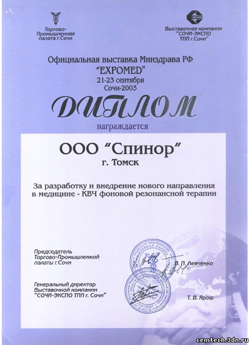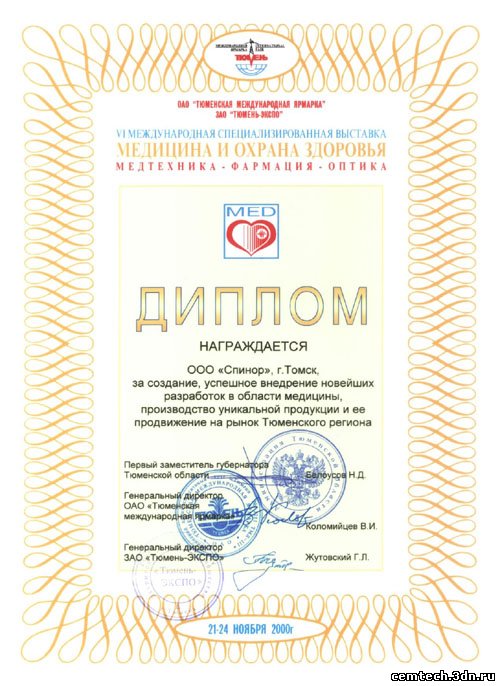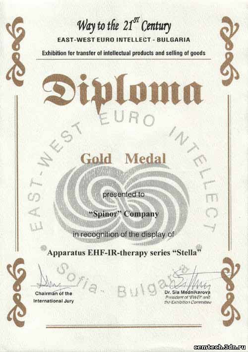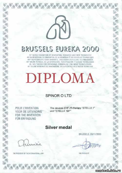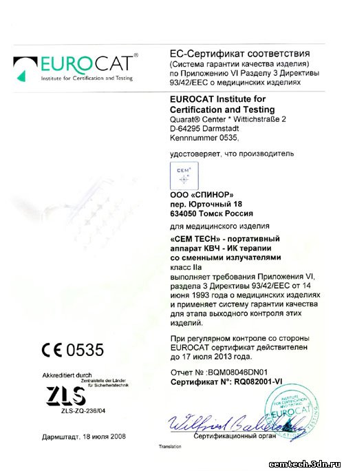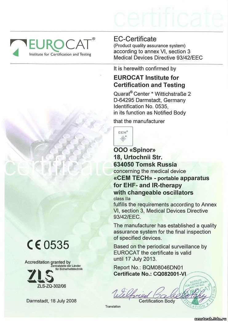 ЕС - Сертификат - система гарантии качества продукции Институтом EUROCAT подтверждено, что производитель ООО «Spinor» (Россия, г.Томск), медицинский аппарат "CEM®TECH" (портативный аппарат со сменными излучателями класса IIa) удовлетворяют требованиям в соответствии с приложением №6, раздела №3 Директивы 93/42 ЕЕС. Этот документ дает основания продвижению технология с использованием аппаратов серии "CEM TECH" на Европейском рынке, и долгожданную возможность использования в медицинской практике мед. учреждениям в странах ЕВРО-содружества.